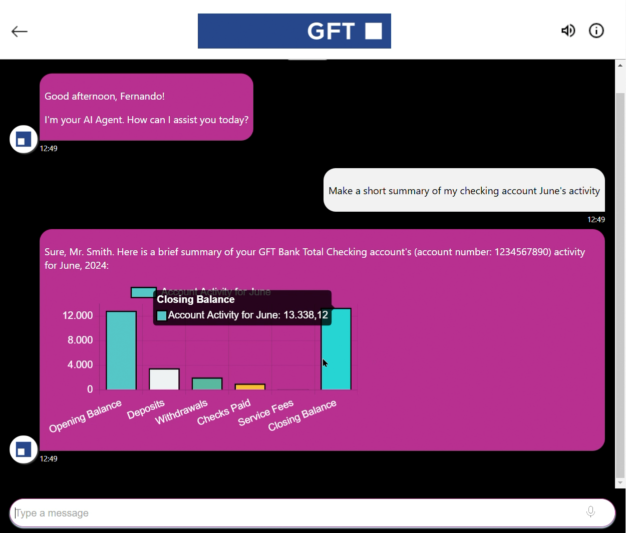 El agente bancario inteligente de GFT es una solución de inteligencia artificial de vanguardia que revoluciona la banca digital. Este asistente virtual 24/7 gestiona consultas y transacciones de cuentas, proporcionando asesoramiento financiero personalizado a través de interacciones naturales. Aumenta la satisfacción del cliente, optimiza las operaciones y obtén una ventaja competitiva. Experimenta la banca inteligente y fluida que se adapta a tus necesidades. Transforma tu entidad financiera con la tecnología de IA de última generación.